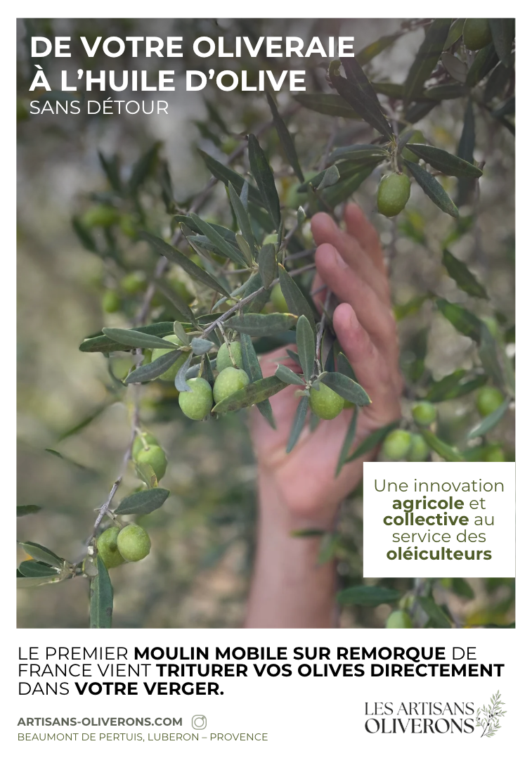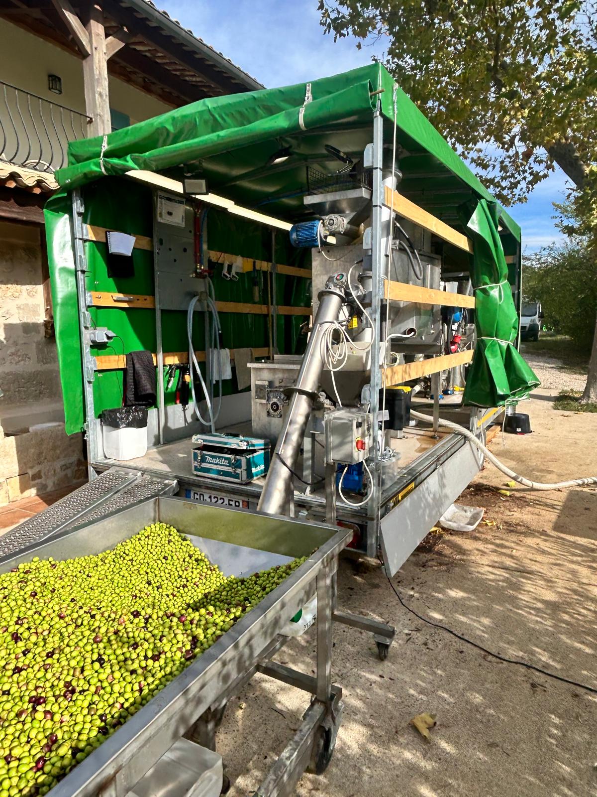 Le premier moulin mobile de France est une innovation agricole conçue pour rapprocher la transformation du champ. Il permet de triturer les olives des producteurs directement sur le domaine, tout au long de la cueillette.